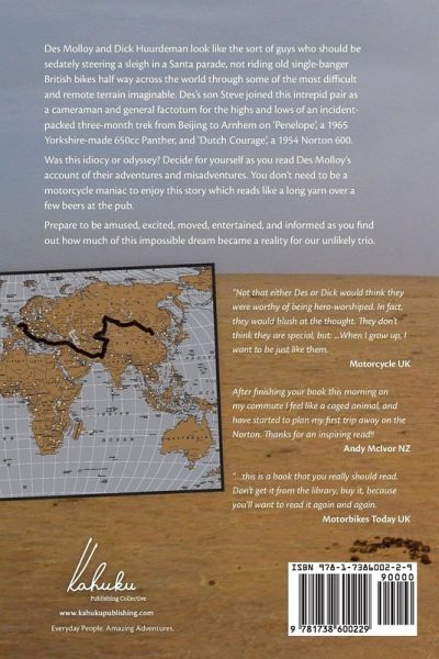Des Molloy and Dick Huurdeman look like the sort of guys who should be sedately steering a sleigh in a Santa parade, not riding old single-banger British bikes half way across the world through some of the most difficult and remote terrain imaginable. Des's son Steve joined this intrepid pair as a cameraman and general factotum for the highs and lows of an incident-packed three-month trek from Beijing to Arnhem on 'Penelope', a 1965 Yorkshire-made 650cc Panther, and 'Dutch Courage', a 1954 Norton 600. Was this idiocy or odyssey? Decide for yourself as you read Des Molloy's account of their adventures and misadventures. You don't need to be a motorcycle maniac to enjoy this story which reads like a long yarn over a few beers at the pub. Prepare to be amused, excited, moved, entertained, and informed as you find out how much of this impossible dream became a reality for our unlikely trio.