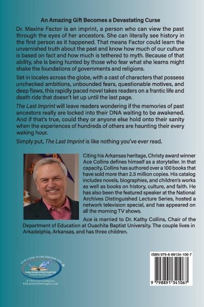 An Amazing Gift Becomes a Devastating Curse Dr. Maxine Factor is an imprint, a person who can view the past through the eyes of her ancestors. She can literally see history in the first person as it happened. That means Factor could learn the unvarnished truth about the past and know how much of our culture is based on fact and how much is tethered to myth. Because of that ability, she is being hunted by those who fear what she learns might shake the foundations of governments and religions. Set in locales across the globe, with a cast of characters that possess unchecked ambitions, unbounded fears, questionable motives, and deep flaws, this rapidly paced novel takes readers on a frantic life and death ride that doesn't let up until the last page. The Last Imprint will leave readers wondering if the memories of past ancestors really are locked into their DNA waiting to be awakened. And if that's true, could they or anyone else hold onto their sanity when the experiences of hundreds of others are haunting their every waking hour. Simply put, The Last Imprint is like nothing you've ever read.