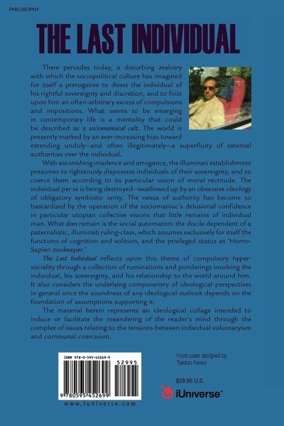 There pervades today, a disturbing zealotry with which the sociopolitical culture has imagined for itself a prerogative to divest the individual of his rightful sovereignty and discretion, and to foist upon him an often-arbitrary excess of compulsions and impositions. What seems to be emerging in contemporary life is a mentality that could be described as a sociomaniacal cult. The world is presently marked by an ever-increasing bias toward extending unduly-and often illegitimately-a superfluity of external authorities over the individual. With astonishing insolence and arrogance, the illuminati establishment presumes to righteously dispossess individuals of their sovereignty, and to coerce them according to its particular vision of moral rectitude. The individual per se is being destroyed-swallowed up by an obsessive ideology of obligatory symbiotic unity. The nexus of authority has become so bastardized by the operation of the sociomaniac's delusional confidence in particular utopian collective visions that little remains of individual man. What does remain is the social automaton: the docile dependent of a paternalistic, illuminati ruling-class, which assumes exclusively for itself the functions of cognition and volition, and the privileged status as 'Homo-Sapien zookeeper.' The Last Individual reflects upon this theme of compulsory hyper-sociality through a collection of ruminations and ponderings involving the individual, his sovereignty, and his relationship to the world around him. It also considers the underlying componentry of ideological perspectives in general since the soundness of any ideological outlook depends on the foundation of assumptions supporting it. The material herein represents an ideological collage intended to induce or facilitate the meandering of the reader's mind through the complex of issues relating to the tensions between individual voluntaryism and communal coercivism.