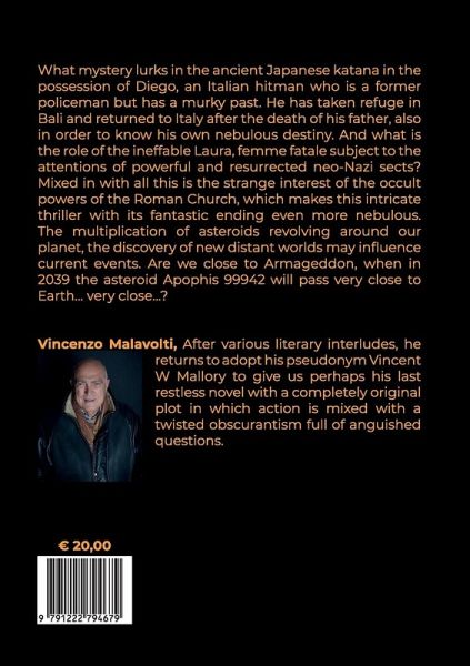 This is an international thriller that starts with two prefaces describing the birth of a mysterious katana, the last forged by the fabled Muramasa, a craftsman much talked about in ancient Japanese stories. Due to a series of events that are narrated in the preface, the sword in question ends up in the hands of Diego Malmerendi, an Italian hitman with a dark past. Then the never-dissolved and powerful neo-Nazi sects and even the Roman Church come into play. Thus is set in motion a deadly hunt for the Italian possessor of the mysterious Katana, which is joined by an ineffable female character, Laura, a beautiful 'femme fatale' with a mysterious childhood. With numerous narrative leaps into the past, the plot becomes increasingly gripping and enthralling, I would almost say frenetic, enriched by very interesting characters, until Muramasa's last katana finds the source of his material, the key to access a misunderstood world into which both Diego and Laura will be plunged.... The year 2039 is near, the asteroid is about to pass close to the Earth, very close, and this deadline seems to be linked to the not at all predictable epilogue of this anomalous thriller to be read in one go. Highly recommended for lovers of oriental stories and all those who want action and mystery.