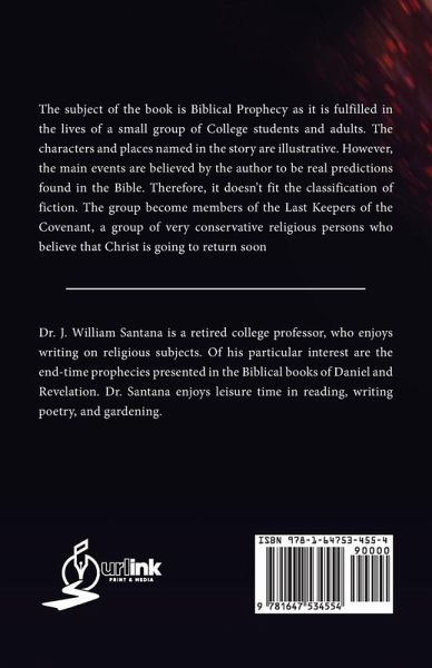 The subject of the book is Biblical Prophecy as it is fulfilled in the lives of a small group of College students and adults. The characters and places named in the story are illustrative. However, the main events are believed by the author to be real predictions found in the Bible. Therefore, it doesn't fit the classification of fiction. The group become members of the Last Keepers of the Covenant, a group of very conservative religious persons who believe that Christ is going to return soon Dr. J. William Santana is a retired college professor, who enjoys writing on religious subjects. Of his particular interest are the end-time prophecies presented in the Biblical books of Daniel and Revelation. Dr. Santana is married to Vasthy E. Sanchez, and they have two children: Jared, a physician, and Melissa, a school teacher. They have four grandchildren.