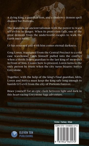 A dying king, a guardian lion, and a shadowy demon spell disaster for Portents. The skandola-an ancient talisman with the power to ward off evil-is in danger. When its protection fails, one of the great demons from the underworld escapes to walk the Earth once more. Ur has returned and with him comes eternal darkness. Greg Loren, reassigned from the Central Precinct to a cold case warehouse, finds himself pulled into the conflict when a Shishi lion-a guardian to the last king of men-dies in front of him. Unsure how to proceed, Loren turns to the only person he trusts when the city turns bizarre: Soriya Greystone. Together, with the help of the king's final guardian, Idris, Loren and Soriya must keep the king safe long enough to banish Ur's evil from the city of Portents forever. Brace yourself for an epic clash between light and dark in this heart-racing Greystone Saga adventure.