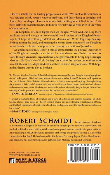 Is there real help for the hurting people in our world? We think of the children in war, refugees adrift, patients without medicine, and those dying in droughts and floods. Lest we despair, Jesus announces that the Kingdom of God is near. This book defines the Kingdom anew and shows how it brings us hope even in the worst of circumstances. The Kingdom of God is bigger than we thought. When God was King there was liberation and enough to survive and thrive. Promises of the Kingdom's blessings kept hope alive through defeat and devastation. While forgiving, healing, feeding, raising the dead, and praising the enemy, Jesus announced the Kingdom was at hand even before he wept over the coming destruction of Jerusalem. As a political scientist, Robert Schmidt demonstrates the political importance of the Kingdom through the centuries. He also shows how Christ continues to work through churches, organizations, and governments to bring hope through what he calls ""God's New World Society."" As a pastor he reaches out to those who have left the church. Might God still use them in Jesus' Kingdom work? With hope in their hearts there is a lot to be done.