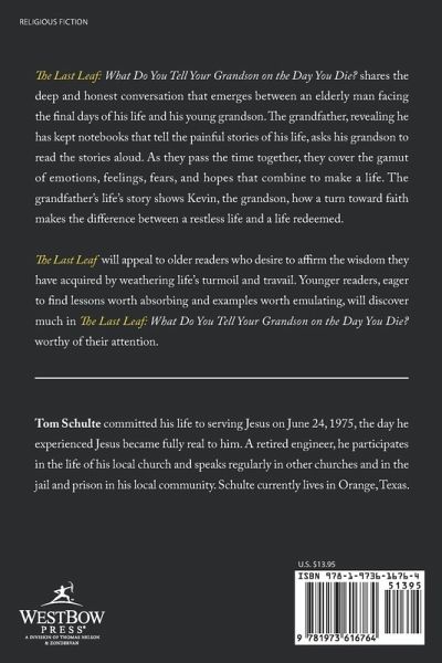The Last Leaf: What Do You Tell Your Grandson on the Day You Die? shares the deep and honest conversation that emerges between an elderly man facing the final days of his life and his young grandson. The grandfather, revealing he has kept notebooks that tell the painful stories of his life, asks his grandson to read the stories aloud. As they pass the time together, they cover the gamut of emotions, feelings, fears, and hopes that combine to make a life. The grandfathers lifes story shows Kevin, the grandson, how a turn toward faith makes the difference between a restless life and a life redeemed. The Last Leaf will appeal to older readers who desire to affirm the wisdom they have acquired by weathering lifes turmoil and travail. Younger readers, eager to find lessons worth absorbing and examples worth emulating, will discover much in The Last Leaf: What Do You Tell Your Grandson on the Day You Die? worthy of their attention.