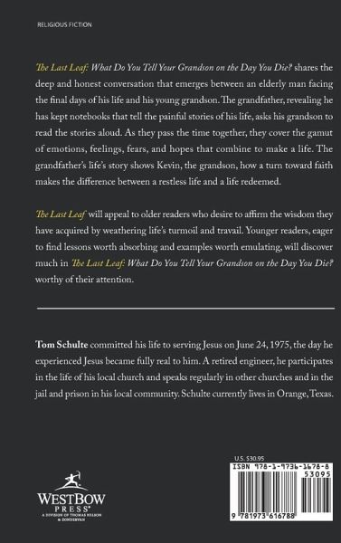 The Last Leaf: What Do You Tell Your Grandson on the Day You Die? shares the deep and honest conversation that emerges between an elderly man facing the final days of his life and his young grandson. The grandfather, revealing he has kept notebooks that tell the painful stories of his life, asks his grandson to read the stories aloud. As they pass the time together, they cover the gamut of emotions, feelings, fears, and hopes that combine to make a life. The grandfathers lifes story shows Kevin, the grandson, how a turn toward faith makes the difference between a restless life and a life redeemed. The Last Leaf will appeal to older readers who desire to affirm the wisdom they have acquired by weathering lifes turmoil and travail. Younger readers, eager to find lessons worth absorbing and examples worth emulating, will discover much in The Last Leaf: What Do You Tell Your Grandson on the Day You Die? worthy of their attention.