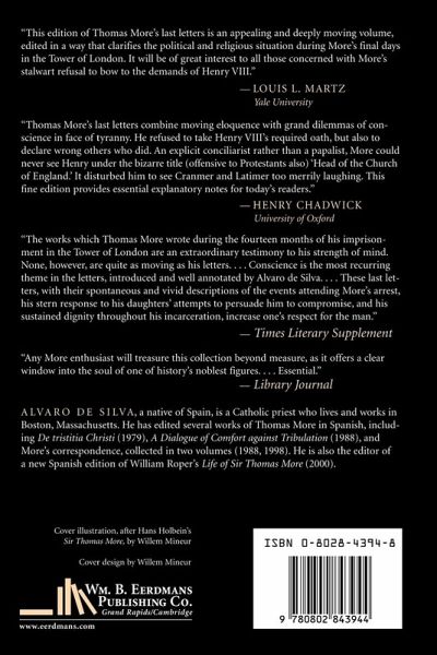 In the spring of 1534, Thomas More was taken to the Tower of London, and after fourteen months in prison, the brilliant author of Utopia, friend of Erasmus and the humanities, highly respected judge, family man, and former Lord Chancellor of England was beheaded on Tower Hill. Yet More wrote some of his best works as a prisoner, including A Dialogue of Comfort against Tribulation and a commentary on the agony of Christ (De tristitia Christi). His last letters, too, are works of art that are both historically important and religiously significant. The Last Letters of Thomas More is a superb new edition of More's prison correspondence, introduced and fully annotated for contemporary readers by Alvaro de Silva. Based on the critical edition of More's correspondence, this volume begins with letters penned by More to Cromwell and Henry VIII in the spring of 1534 and ends with More's last words to Margaret Roper, his daughter, on the eve of his execution, July 6, 1535. More writes on a host of topics — prayer and penance, the right use of riches and power, the joys of heaven, the challenges of maintaining moral virtue, and much more. These letters also reveal much about More himself, especially his understanding of "conscience." The strength of his conscience was reinforced by the Word of God coming in all its power through Scripture, and by remembering all the faithful of the church. In his vivid imagination of that glorious "company of saints," More found the courage to follow his conscience even unto death. "It is a case," he wrote, "in which a man may lose his head and yet have none harm, but instead of harm inestimable good at the hand of God." Providing a rich complement to these letters is de Silva's commentary. In it he throws light on the literary works that More wrote in prison, and explores the religious and political conditions of Tudor England. And always he reminds us of More — of the man whose unshakable faith and shining example draw us to him today.
