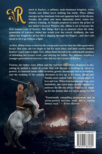 Raised in Karkov, a military, male-dominant kingdom, twins Natalia and Jillian know nothing but battle. When Jillian emerges as the dominant twin and apparent heir to the throne, Natalia, the softer and more diplomatic sister, ceases her military training. As Natalia prepares to marry the prince of her father's favored Western ally, Jillian is set to become the first woman Lion of Karkov. But things don't go as planned when the older generation of warriors values her womb over her sword. Suddenly, the role Jillian has fought for all her life is slipping through her fingers...and she's not about to let it go without a fight. At first, Jillian wants to destroy the young male warrior that the older generation favors. But soon, the two begin to fall for each other, and dark secrets behind Karkov's past come to light. Now, Jillian finds herself in the unthinkable position of defending her former rival...and defying her father. Her defiance inspires a younger generation of warriors, who dub her the Lioness of Karkov. Furious, her father ousts Jillian and the warriors who swore allegiance to her, setting in motion a chain of events that will disrupt everything he swore to protect. As innocent lands suffer invasion, greedy monarchies fall to revolution, and the wedding of the century threatens to live up to its name, Jillian and Natalia must reckon with the consequences of love and war. When four nations converge on a battlefield, one sister must decide whether to embrace the life she always wanted-or stand up for the destiny that was never meant for her.