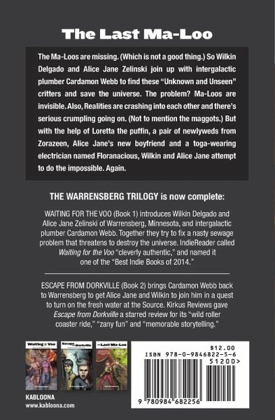 THE LAST MA-LOO is the third book in The Warrensberg Trilogy, which includes Waiting for the Voo (Book 1) and Escape from Dorkville (Book 2). In The Last Ma-Loo, intergalactic plumber Cardamon Webb returns to Warrensberg, Minnesota, to ask 15-year-old Wilkin Delgado and 16-year-old Alice Jane Zelinski to help him find the missing (and invisible) Ma-Loos somewhere on the Underside of the universe. To complicate matters, the universe is crumpling and Realities are crashing into each other, which means that everybody and everything will soon be turned to dust. In their quest, they're joined by Lorretta the puffin, a pair of newlyweds from Zorazeen, Alice Jane's new boyfriend and a toga-wearing electrician named Floranacious. The Last Ma-Loo is narrated in alternating chapters by Wilkin (who wears Power Rangers boxers) and Alice Jane (a gray-haired bacon-smelling doughnut-loving outcast from Missouri with serious anger issues). Wilkin explains, "I peeked out the living room window at the two strange creatures that were huddled around our mailbox. They looked like hairy, unwashed manatees wearing matching purple polo shirts, fedora hats and Hello Kitty backpacks. They also did a lot of picture taking and high-pitched chattering in some unknown language." Alice Jane says, "I always thought Leo and I had something special, but in two years he hasn't felt the need to drive to Minnesota to visit me, and the closest he's come to asking me on a date is saying, 'Alice Jane, you need a vacation.' Like it would hurt him to get his lazy ass up here to Dorkville and shower me with a little attention." Can they find the Ma-Loos and save the universe? Probably not.