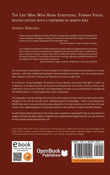 No one has given the polymath Thomas Young (1773-1829) the all-round examination he so richly deserves-until now. Celebrated biographer Andrew Robinson portrays a man who solved mystery after mystery in the face of ridicule and rejection, and never sought fame. As a physicist, Young challenged the theories of Isaac Newton and proved that light is a wave. As a physician, he showed how the eye focuses and proposed the three-colour theory of vision, only confirmed a century and a half later. As an Egyptologist, he made crucial contributions to deciphering the Rosetta Stone. It is hard to grasp how much Young knew. This biography is the fascinating story of a driven yet modest hero who cared less about what others thought of him than for the joys of an unbridled pursuit of knowledge-with a new foreword by Martin Rees and a new postscript discussing polymathy in the two centuries since the time of Young. It returns this neglected genius to his proper position in the pantheon of great scientific thinkers.