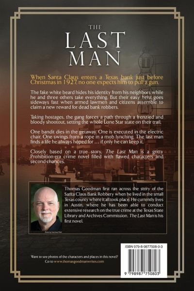 2024 Spur Award Winner! 2024 Will Rogers Medallion Award Winner! Grand Prize Winner for the 2023 Chanticleer Laramie Award for Americana Fiction! "A novel as compelling as the incredible true story it's based on." James Wade, two-time Spur Award-winning author of Hollow Out the Dark.; When Santa Claus enters a Texas bank just before Christmas in 1927, no one expects him to pull a gun. The fake white beard hides his identity from his neighbors while he and three others take everything. But their easy heist goes sideways fast when armed lawmen and citizens assemble to claim a new reward for dead bank robbers. Taking hostages, the gang forces a path through a frenzied and bloody shootout, setting the whole Lone Star state on their trail. One bandit dies in the getaway. One is executed in the electric chair. One swings from a rope in a mob lynching. The last man finds a life he always hoped for ... if only he can keep it. Closely based on a true crime, The Last Man is a gritty Prohibition-era Western novel filled with flawed characters and second chances. "Do not miss this fabulous Texas tale!" Kathleen Y'Barbo, Publishers Weekly bestselling author of The Black Midnight and the Bayou Nouvelle series.