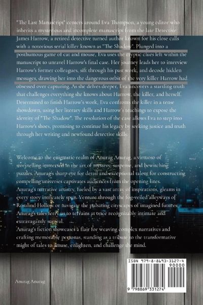 "The Last Manuscript" centers around Eva Thompson, a young editor who inherits a mysterious and incomplete manuscript from the late Detective James Harrow, a retired detective turned author known for his close calls with a notorious serial killer known as "The Shadow". Plunged into a posthumous game of cat and mouse, Eva uses the cryptic clues left within the manuscript to unravel Harrow's final case. Her journey leads her to interview Harrow's former colleagues, sift through his past work, and decode hidden messages, drawing her into the dangerous orbit of the very killer Harrow had obsessed…mehr