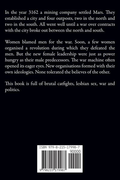 In the year 3162 a mining company settled Mars. They established a city and four outposts, two in the north and two in the south. All went well until a war over contracts with the city broke out between the north and south. Women blamed men for the war. Soon, a few women organised a revolution during which they defeated the men. But the new female leadership were just as power hungry as their male predecessors. The war machine often opened its eager eyes. New organisations formed with their own ideologies. None tolerated the believes of the other. This book is full of brutal catfights, lesbian sex, war and politics.