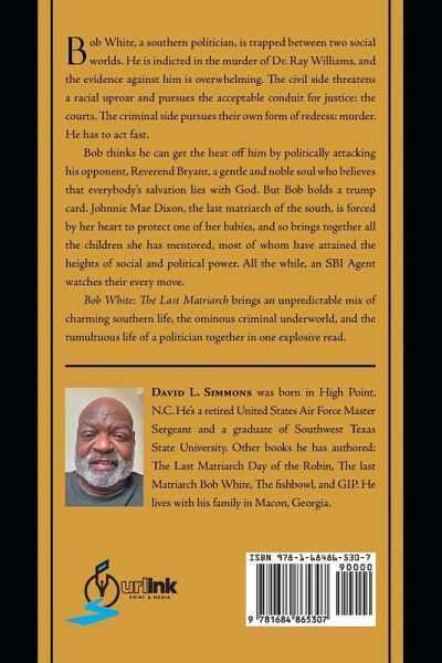 Bob White, a southern politician, is trapped between two social worlds. He is indicted in the murder of Dr. Ray Williams, and the evidence against him is overwhelming. The civil side threatens a racial uproar and pursues the acceptable conduit for justice: the courts. The criminal side pursues their own form of redress: murder. He has to act fast. Bob thinks he can get the heat off him by politically attacking his opponent, Reverend Bryant, a gentle and noble soul who believes that everybody's salvation lies with God. But Bob holds a trump card. Johnnie Mae Dixon, the last matriarch of the south, is forced by her heart to protect one of her babies, and so brings together all the children she has mentored, most of whom have attained the heights of social and political power. All the while, an SBI Agent watches their every move. Bob White: The Last Matriarch brings an unpredictable mix of charming southern life, the ominous criminal underworld, and the tumultuous life of a politician together in one explosive read.