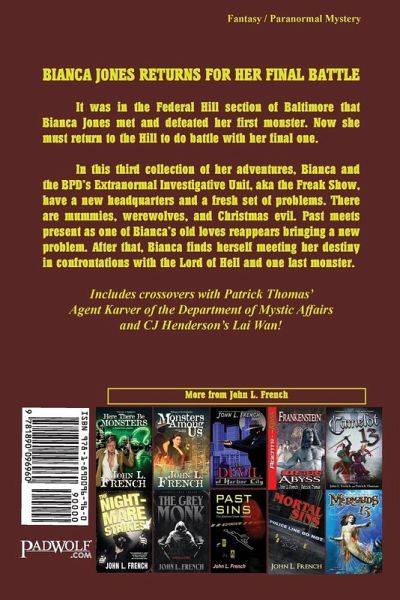 BIANCA JONES RETURNS FOR HER FINAL BATTLE! It was in the Federal Hill section of Baltimore that Bianca Jones met and defeated her first monster. Now she must return to the Hill to do battle with her final one. In this third collection of her adventures, Bianca and the BPD's Extranormal Investigative Unit, aka the Freak Show, have a new headquarters and a fresh set of problems. There are mummies, werewolves, and Christmas evil. Past meets present as one of Bianca's old loves reappears bringing a new problem. After that, Bianca finds herself meeting her destiny in confrontations with the Lord of Hell and one last monster. Includes crossovers with Patrick Thomas's Agent Karver of the Department of Mystic Affairs and CJ Henderson's Lai Wan!