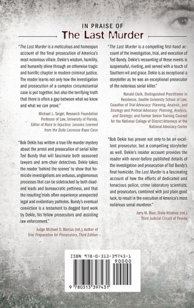 This eye-opening book uses the case of Ted Bundy to show how a case against a serial killer is investigated, how problems common to such cases are overcome, and how the prosecution team marshals and presents the evidence at trial. The Last Murder: The Investigation, Prosecution, and Execution of Ted Bundy follows the facts and circumstances of Kim Leach's disappearance and the investigation and prosecution of Ted Bundy in rough chronological order, from Bundy's escape from a Colorado jail in 1977 to his execution at Florida State Prison in 1989. It provides an inside look at the intricacies and complications of this historic case that spanned many states and jurisdictions, documenting how unselfishness and dogged determination were key to solving the case. The story is told from the vantage point of one intimately involved in both the investigation and prosecution of the criminal, clearly showing how friction between agencies can impede the investigation and how cooperation can expedite a solution. The book emphasizes the important role played by circumstantial evidence and forensic science, explores the impact of pervasive publicity upon such an investigation, critiques the investigation and prosecution of Bundy, and offers suggestions on how-and how not-to deal with "celebrity killers" in the future.
