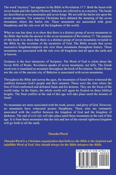 The word "mystery" last appears in the Bible in Revelation 17:7. Both the beast with seven heads and the harlot are referred to as a mystery. The heads are described as seven mountains and seven kings. We are told the harlot sits upon the seven mountains. For centuries Christians have debated the meaning of the seven mountains where Mystery Babylon sits. These mountains are associated with great blasphemy and the rule over all the kingdoms of the world. What no one has done is to show that there is a distinct group of seven mountains in the Bible that holds the answer to the seven mountains of Revelation 17. Scripture is the best interpreter of Scripture. The Word of God is silent about the Seven Hills of Rome. Revelation speaks of seven mountains, not hills. The Greek word oros is translated as mountain throughout the book of Revelation. Neither Rome nor the site of the ancient city of Babylon is associated with seven mountains. Throughout the Bible and across the ages, the mountains of Israel have witnessed the conflicts between God's people and their enemies. These were the sites where the Son of God confronted and defeated Satan and his demons. They are the focus of the world today. In the future, the whole world will again be fixated on these biblical heights. The final conflict at the end of this age will take place amid the mounts of Israel. The purpose of this book is to show that there is a distinct group of seven mountains revealed in the Bible by the revelator of the mysteries of God. The Bible reveals that seven successive kingdoms/empires rule over these mountains throughout history. These mountains are associated with the rule over all kingdoms and all upon the earth and in heaven. No mountains are more associated with the truth, power, and glory of God. However, no mountains have witnessed greater blasphemy. These sites are intimately associated with the conflict between the kingdom of God and the kingdom of darkness. The end of evil rule will take place amid these mountains at the end of this age. It is from these mountains that the rule and law of the eternal righteous kingdom will go forth to all the earth.