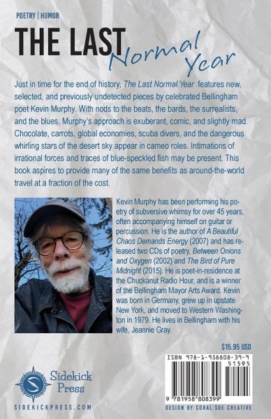 Just in time for the end of history, The Last Normal Year features new, selected, and previously undetected pieces by celebrated Bellingham poet Kevin Murphy. With nods to the beats, the bards, the surrealists, and the blues, Murphy's approach is exuberant, comic, and slightly mad. Chocolate, carrots, global economies, scuba divers, and the dangerous whirling stars of the desert sky appear in cameo roles. Intimations of irrational forces and traces of blue-speckled fish may be present. This book aspires to provide many of the same benefits as around-the-world travel at a fraction of the cost.