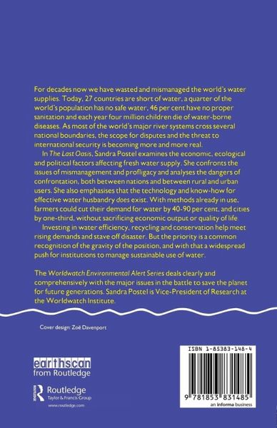 For decades now we have wasted and mismanaged the world?s water supplies. Today, 27 countries are short of water, a quarter of the world?s population has no safe water, 46 per cent have no proper sanitation and each year four million children die of water-borne diseases. As most of the world?s major river systems cross several national boundaries, the scope disputes and the threat to international security is becoming more and more real. In The Last Oasis, Sandra Postel examines the economic, ecological and political factors affecting fresh water supply. She confronts the issues of mismanagement and profligacy and analyses and dangers of confrontation, both between nations and between rural and urban users. She also emphasises that the technology and know-how for effective water husbandry does exist. With methods already in use, farmers could cut their demand for water by 40-90 per cent, and cities by one-third, without sacrificing economic output or quality of life. Investing in water efficiency, recycling and conservation help meet rising demands and stave off disaster. But the priority is a common recognition of the gravity of the position, and with that a widespread push for institutions to manage sustainable use of water.