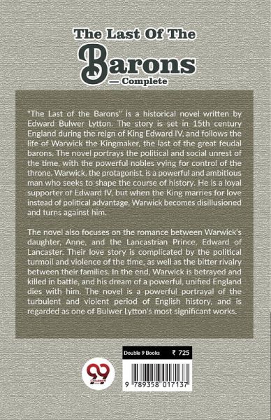 "The Last of the Barons" is a historical novel written by Edward Bulwer Lytton. The story is set in 15th century England during the reign of King Edward IV, and follows the life of Warwick the Kingmaker, the last of the great feudal barons. The novel portrays the political and social unrest of the time, with the powerful nobles vying for control of the throne. Warwick, the protagonist, is a powerful and ambitious man who seeks to shape the course of history. He is a loyal supporter of Edward IV, but when the King marries for love instead of political advantage, Warwick becomes disillusioned and turns against him. The novel also focuses on the romance between Warwick's daughter, Anne, and the Lancastrian Prince, Edward of Lancaster. Their love story is complicated by the political turmoil and violence of the time, as well as the bitter rivalry between their families. In the end, Warwick is betrayed and killed in battle, and his dream of a powerful, unified England dies with him. The novel is a powerful portrayal of the turbulent and violent period of English history, and is regarded as one of Bulwer Lytton's most significant works.
