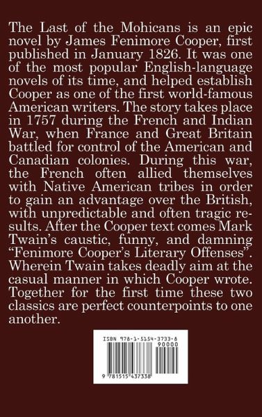 The Last of the Mohicans is an epic novel by James Fenimore Cooper, first published in January 1826. It was one of the most popular English-language novels of its time, and helped establish Cooper as one of the first world-famous American writers. The story takes place in 1757 during the French and Indian War, when France and Great Britain battled for control of the American and Canadian colonies.