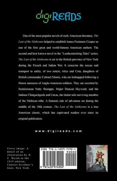 One of the most popular novels of early American literature, "The Last of the Mohicans" helped to establish James Fenimore Cooper as one of the first great and world-famous American authors. The second and best known novel in the "Leatherstocking Tales" series, "The Last of the Mohicans" is set in the British province of New York during the French and Indian War. It concerns the rescue and transport to safety, of two sisters, Alice and Cora, daughters of British commander Colonel Munro, who are kidnapped following a Huron massacre of Anglo-American soldiers. They are escorted by frontiersman Natty Bumppo, Major Duncan Heyward, and the Indians Chingachgook and Uncas, the titular sole surviving member of the Mohican tribe. A fantastic tale of adventure set during the middle of the 18th century, "The Last of the Mohicans" is a true American classic, which has captivated readers ever since its original publication. This edition is printed on premium acid-free paper.