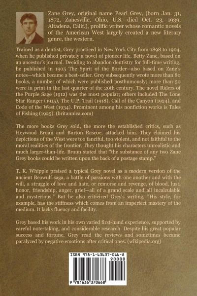 Pearl Zane Grey, the fourth child of Alice Josephine Zane and Lewis Gray, was born in Zanesville, Ohio. After Zane's birth, the family changed their last name from Gray to Grey. Lewis Grey, a dentist, did not want his son to waste his time writing stories. Lewis ripped up Zane's first story when he was only fifteen. The only thing Zane wanted to do was play baseball and write, but he was forced into dentistry for practical reasons. Zane attended the University of Pennsylvania on a baseball scholarship. He was a decent athlete and played in the minor leagues. After graduation with a degree in dentistry, Zane moved to New York and opened his dentistry business where he struggled with his need to write. He went camping and fishing with his brother in Pennsylvania where he met Lina Roth, known as Dolly. Zane and Dolly were married in 1905. He warned her he would not stop being a free spirit and had numerous affairs after his marriage. In 1918, the Zanes moved to California and settled in Altadena in 1920. Dolly, a former schoolteacher, edited all of Zane's manuscripts and managed his career including all his contracts. Zane traveled and explored the west, went fishing, and wrote. He had a cabin in Oregon on the Rogue River, and in the desert by the Mogollon Rim near Payson, Arizona. He wrote articles for magazines, serializations, and novels. His most famous novel was Riders of the Purple Sage. In 1939, Zane Grey died at the age of 67. After his death, his wife and son published some of his unfinished novels. At least fifty movies were made based on his novels.