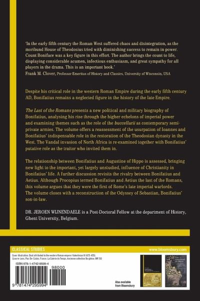 Despite his critical role in the western Roman Empire during the early fifth century AD, Bonifatius remains a neglected figure in the history of the late Empire. The Last of the Romans presents a new political and military biography of Bonifatius, analysing his rise through the higher echelons of imperial power and examining themes such as the role of the buccellarii as contemporary semi-private armies. The volume offers a reassessment of the usurpation of Ioannes and Bonifatius' indispensable role in the restoration of the Theodosian dynasty in the West. The Vandal invasion of North Africa is re-examined together with Bonifatius's putative role as the traitor who invited them in. The relationship between Bonifatius and Augustine of Hippo is assessed, bringing new light to the important, yet largely unstudied, influence of Christianity in Bonifatius's life. A further discussion revisits the rivalry between Boniface and Aetius. Although Procopius termed Bonifatius and Aetius the last of the Romans, this volume argues that they were the first of Rome's late imperial warlords. The volume closes with a reconstruction of the Odyssey of Sebastian, Bonifatius' son-in-law.