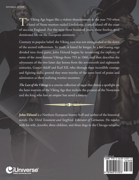 The Viking Age began like a violent thunderstorm in the year 793 when a band of Norse warriors raided Lindisfarne, a small island off the coast of ancient England. For the next three hundred years, these fearless men dominated life on the European continent. Contrary to popular belief, the Viking aura was not extinguished at the dawn of the second millennium. In truth, it lasted far longer. In a fascinating saga divided into three parts, John Eklund begins by recounting the exploits of some of the most famous Vikings from 793 to 1066, and then describes the adventures of the two latter day heroes from the seventeenth and eighteenth centuries, Gustav Adolf and Karl XII, who through their incredible courage and fighting skills, proved they were worthy of the same level of praise and admiration as their seafaring warrior ancestors. The Last of the Vikings is a concise collection of sagas that shines a spotlight on the hero warriors of the Viking Age that include the greatest of the Norsemen and the king who lost an empire but saved a nation.