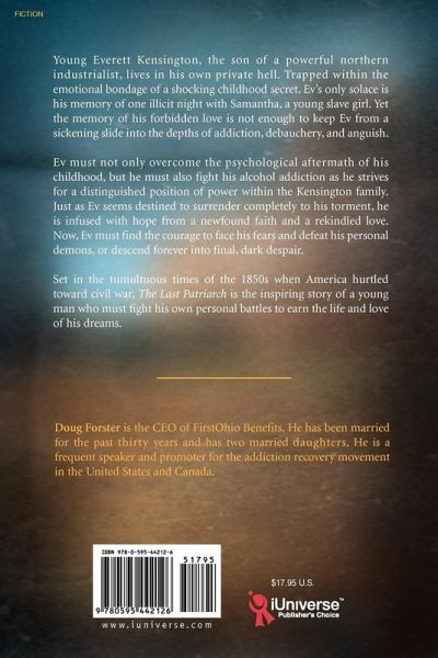 Young Everett Kensington, the son of a powerful Northern industrialist, lives in his own private hell. Trapped within the emotional bondage of a shocking childhood secret, Ev's only solace is his memory of one illicit night with Samantha, a young slave girl. Yet the memory of his forbidden love is not enough to keep Ev from a sickening slide into the depths of addiction, debauchery, and anguish. Ev must not only overcome the psychological aftermath of his childhood, but he must also fight his alcohol addiction as he strives for a distinguished position of power within the Kensington family. Just as Ev seems destined to surrender completely to his torment, he is infused with hope from a newfound faith and a rekindled love. Now, Ev must find the courage to face his fears and defeat his personal demons, or descend forever into final, dark despair. Set in the tumultuous times of the 1850s when America hurtled toward civil war, The Last Patriarch is the inspiring story of a young man who must fight his own personal battles to earn the life and love of his dreams.