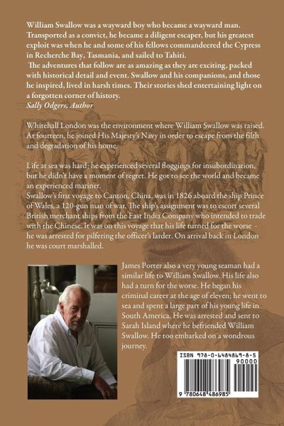 William Swallow was a wayward boy who became a wayward man. Transported as a convict, he became a diligent escaper, but his greatest exploit was when he and some of his fellows commandeered the Cypress in Recherche Bay Tasmania and sailed to Tahiti. The adventures that follow are as amazing as they are exciting, packed with historical detail and event. Swallow and his companions, and those he inspired, lived in harsh times. Their stories shed entertaining light on a forgotten corner of history. - Sally Odgers, Author Whitehall London was the environment where William Swallow was raised. At fourteen, he joined His Majesty's Navy in order to escape from the filth and degradation of his home. Life at sea was hard; he experienced several floggings for insubordination, but he didn't have a moment of regret. He got to see the world and became an experienced mariner. Swallow's first voyage to Canton, China, was in 1826 aboard the ship Prince of Wales, a 120-gun man of war. The ship's assignment was to escort several British merchant ships from the East India Company who intended to trade with the Chinese. It was on this voyage that his life turned for the worse - he was arrested for pilfering the officer's larder. On arrival back in London he was court-marshalled. James Porter, also a very young seaman, had a similar life to William Swallow. His life also had a turn for the worse. He began his criminal career at the age of eleven. He went to sea and spent a large part of his young life in South America. He was arrested and sent to Sarah Island where he befriended William Swallow. He too embarked on a wondrous journey.