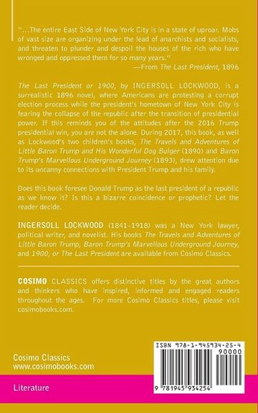 "…The entire East Side of New York City is in a state of uproar. Mobs of vast size are organizing under the lead of anarchists and socialists, and threaten to plunder and despoil the houses of the rich who have wronged and oppressed them for so many years." —From The Last President, 1896 1900, or The Last President, by INGERSOLL LOCKWOOD, is a surrealistic 1896 novel, where Americans are protesting a corrupt election process while the president’s hometown of New York City is fearing the collapse of the republic after the transition of presidential power. If this reminds you of the attitudes after the 2016 Trump presidential win, you are not the alone. During 2017, this book, as well as Lockwood’s two children’s books, The Travels and Adventures of Little Baron Trump and His Wonderful Dog Bulger (1890) and Baron Trump’s Marvellous Underground Journey (1893), drew attention due to its uncanny connections with President Trump and his family. Does this book foresee Donald Trump as the last president of a republic as we know it? Is this a bizarre coincidence or prophetic? Let the reader decide.