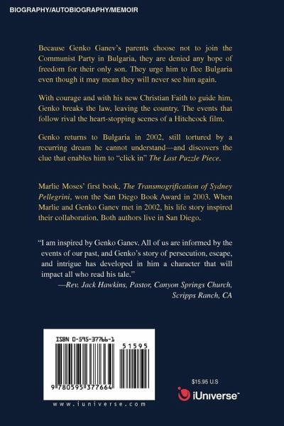 Because Genko Ganev's parents chose not to join the Communist Party in Bulgaria, they were prohibited from the smallest hope of advancement for themselves or their only son. In fact, they "etched in his brain" the suggestion that he flee Bulgaria, even though they might never see him again if he succeeded.and decidedly would not if he failed. With determination, intelligence, and courage, and with his adopted Christian faith to guide him, Genko defied the Communist law against leaving the country. The adventures that followed rival in intensity the nerve-wracking scenes of an Alfred Hitchcock movie. There is also a puzzle here. Plagued by recurring dreams that would not give him peace, Genko returned to Bulgaria to solve the puzzle. Then in a mystical dream, he found the clue that enabled him to "click in" The Last Puzzle Piece.