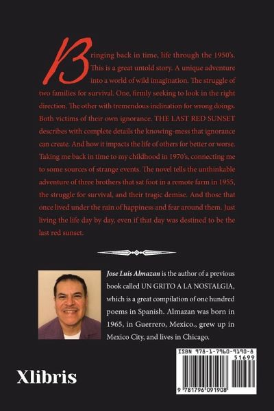 Bringing back in time, life through the 1950's. This is a great untold story. A unique adventure into a world of wild imagination. The struggle of two families for survival. One, firmly seeking to look in the right direction. The other with tremendous inclination for wrong doings. Both victims of their own ignorance. THE LAST RED SUNSET describes with complete details the knowing-mess that ignorance can create. And how it impacts the life of others for better or worse. Taking me back in time to my childhood in 1970's, connecting me to some sources of strange events. The novel tells the unthinkable adventure of three brothers that sat foot in a remote farm in 1955, the struggle for survival, and their tragic demise. And those that once lived under the rain of happiness and fear around them. Just living the life day by day, even if that day was destined to be the last red sunset.
