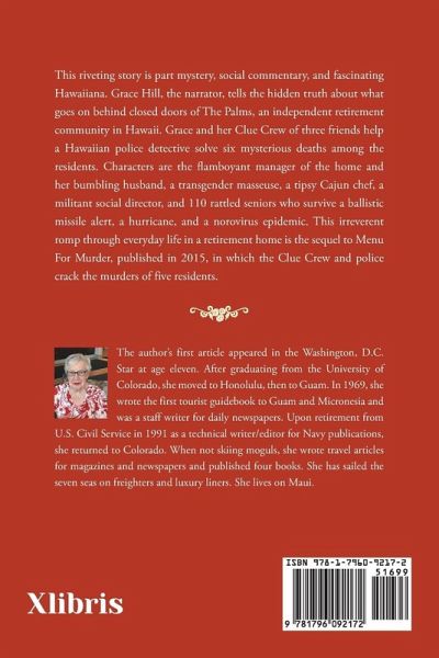 This riveting story is part mystery, social commentary, and fascinating Hawaiiana. Grace Hill, the narrator, tells the hidden truth about what goes on behind closed doors of The Palms, an independent retirement community in Hawaii. Grace and her Clue Crew of three friends help a Hawaiian police detective solve six mysterious deaths among the residents. Characters are the flamboyant manager of the home and her bumbling husband, a transgender masseuse, a tipsy Cajun chef, a militant social director, and 110 rattled seniors who survive a ballistic missile alert, a hurricane, and a norovirus epidemic. This irreverent romp through everyday life in a retirement home is the sequel to Menu For Murder, published in 2015, in which the Clue Crew and police crack the murders of five residents.