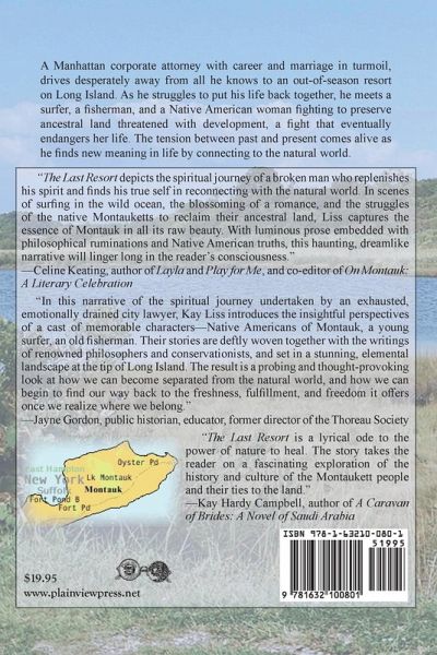 A Manhattan corporate attorney, with career and marriage in turmoil, drives desperately away from all he knows to an out-of-season resort on Long Island. As he struggles to put his life back together, he meets a surfer, a fisherman, and a Native American woman fighting to preserve ancestral land threatened with development, a fight that eventually endangers her life. The tension between past and present comes alive as he finds new meaning in life through the natural world and social justice for a long-oppressed race of people. The novel takes place ion the eastern end of Long Island, the ancestral home of the Montauks, a Native American tribe. The story reveals how they lost their land to the settlers and historical characters come to life in a battle to preserve their land.