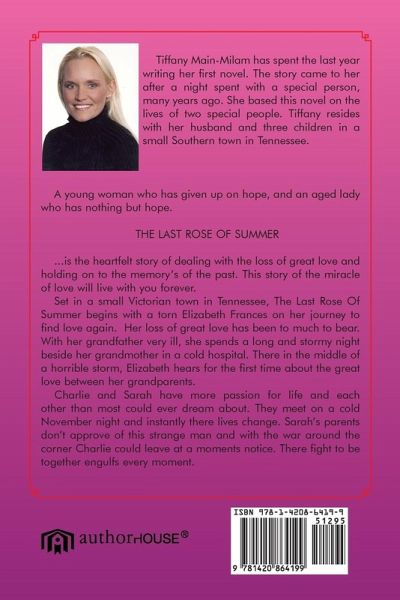 A young woman who has given up on hope, and an aged lady who has nothing but hope. THE LAST ROSE OF SUMMER ...is the heartfelt story of dealing with the loss of great love and holding on to the memory's of the past. This story of the miracle of love will live with you forever. Set in a small Victorian town in Tennessee, The Last Rose Of Summer begins with a torn Elizabeth Frances on her journey to find love again. Her loss of great love has been to much to bear. With her grandfather very ill, she spends a long and stormy night beside her grandmother in a cold hospital. There in the middle of a…mehr