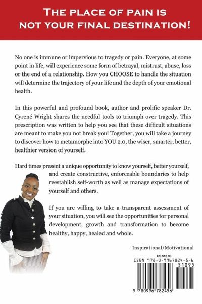 No one is immune or impervious to tragedy or pain. Everyone, at some point in life, will experience some form of betrayal, mistrust, abuse, loss or the end of a relationship. How you CHOOSE to handle the situation will determine the trajectory of your life and the depth of your emotional health. In this powerful and profound book, author and prolific speaker Dr. Cyrene Wright shares the needful tools to triumph over tragedy. This prescription was written to help you see that these difficult situations are meant to make you not break you! Together, you will take a journey to discover how to metamorphe into YOU 2.0, the wiser, smarter, better, healthier version of yourself. Hard times present a unique opportunity to know yourself, better yourself and create constructive, enforceable boundaries to help reestablish self-worth as well as manage expectations of yourself and others. If you are willing to take a transparent assessment of your situation, you will see the opportunities for personal development, growth and transformation to become healthy, happy, healed and whole.