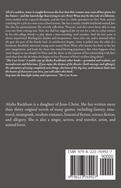 All of a sudden, Anne is caught between the fear that this venture may ruin all her plans for the future-and the knowledge that trying to save Peter Wren may be the role of a lifetime. Anne studied to be a speech therapist, and she lives in a little apartment in New York, actively searching for a job in a non-scary school system. She has a steady, reliable boyfriend named Jim. She also has premonitions. She secretly calls them "Pictures," and she's never been able to stop even one from coming true. Now, her dad has suggested she try out for a role in a play written by his old college friend-a play about a time-traveling, mad scientist. And the last scene is always improvised. Battling her doubts and inexperience, Anne tries out, and is stunned when she gets the part of the female lead. As production begins, Anne is pulled into the orbit of a luminous, fiendishly innocent young actor named Peter Wren, who teaches her how to fire her own imagination, and leads the show into mind-blowing popularity. But what happens when Anne begins to care deeply for Peter and the show, at the expense of her relationship with Jim? And what does she do when she begins to have Pictures of Peter's reckless drug abuse? "The Last Scene" is unlike any of Alydia Rackham's other books-grounded and realistic, yet incandescent and hilarious. If you enjoy the drama of the theatre (both onstage and offstage), the adventure of trying completely new things, the hum of the big city, and intimate looks into the hearts of characters you love, you will adore this book. Step into the limelight today and experience "The Last Scene.