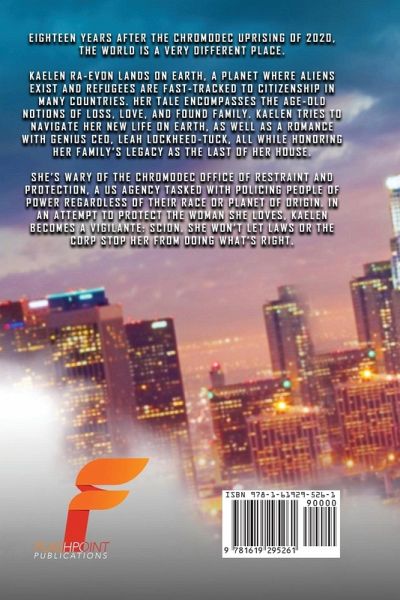 Eighteen years after the Chromodec Uprising of 2020, the world is a very different place. Kaelen Ra-Evon lands on Earth, a planet where aliens exist and refugees are fast-tracked to citizenship in many countries. Her tale encompasses the age-old notions of loss, love, and found family. Kaelen tries to navigate her new life on Earth, as well as a romance with genius CEO, Leah Lockheed-Tuck, all while honoring her family's legacy as the last of her house. She's wary of the Chromodec Office of Restraint and Protection, a US agency tasked with policing people of power regardless of their race or planet of origin. In an attempt to protect the woman she loves, Kaelen becomes a vigilante: Scion. She won't let laws or the CORP stop her from doing what's right.