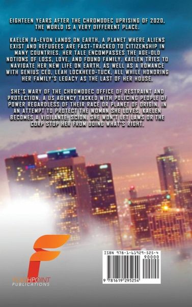 Eighteen years after the Chromodec Uprising of 2020, the world is a very different place. Kaelen Ra-Evon lands on Earth, a planet where aliens exist and refugees are fast-tracked to citizenship in many countries. Her tale encompasses the age-old notions of loss, love, and found family. Kaelen tries to navigate her new life on Earth, as well as a romance with genius CEO, Leah Lockheed-Tuck, all while honoring her family's legacy as the last of her house. She's wary of the Chromodec Office of Restraint and Protection, a US agency tasked with policing people of power regardless of their race or planet of origin. In an attempt to protect the woman she loves, Kaelen becomes a vigilante: Scion. She won't let laws or the CORP stop her from doing what's right.