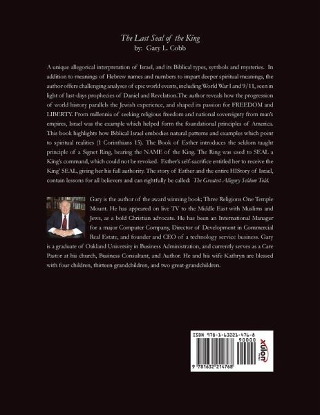 A unique allegorical interpretation of Israel, and its Biblical types, symbols and mysteries. In addition to meanings of Hebrew names and numbers to impart deeper spiritual meanings, the author offers challenging analyses of epic world events, including World War I and 9/11, seen in light of last-days prophecies of Daniel and Revelation.The author reveals how the progression of world history parallels the Jewish experience, and shaped its passion for FREEDOM and LIBERTY. From millennia of seeking religious freedom and national sovereignty from man's empires, Israel was the example which helped form the foundational principles of America. This book highlights how Biblical Israel embodies natural patterns and examples which point to spiritual realities (1 Corinthians 15). The Book of Esther introduces the seldom taught principle of a Signet Ring, bearing the NAME of the King. The Ring was used to SEAL a King's command, which could not be revoked. Esther's self-sacrifice entitled her to receive the King' SEAL, giving her his full authority. The story of Esther and the entire HIStory of Israel, contain lessons for all believers and can rightfully be called: The Greatest Allegory Seldom Told. Gary is the author of the award winning book; Three Religions One Temple Mount. He has appeared on live TV to the Middle East with Muslims and Jews, as a bold Christian advocate. He has been an International Manager for a major Computer Company, Director of Development in Commercial Real Estate, and founder and CEO of a technology service business. Gary is a graduate of Oakland University in Business Administration, and currently serves as a Care Pastor at his church, Business Consultant, and Author. He and his wife Kathryn are blessed with four children, thirteen grandchildren, and two great-grandchildren.