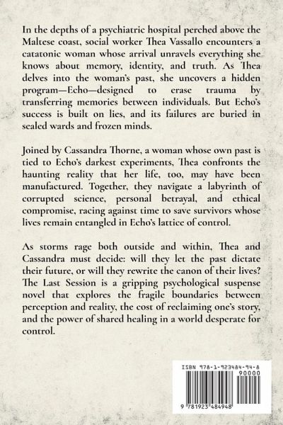 In the depths of a psychiatric hospital perched above the Maltese coast, social worker Thea Vassallo encounters a catatonic woman whose arrival unravels everything she knows about memory, identity, and truth. As Thea delves into the woman's past, she uncovers a hidden program-Echo-designed to erase trauma by transferring memories between individuals. But Echo's success is built on lies, and its failures are buried in sealed wards and frozen minds. Joined by Cassandra Thorne, a woman whose own past is tied to Echo's darkest experiments, Thea confronts the haunting reality that her life, too, may have been manufactured. Together, they navigate a labyrinth of corrupted science, personal betrayal, and ethical compromise, racing against time to save survivors whose lives remain entangled in Echo's lattice of control. As storms rage both outside and within, Thea and Cassandra must decide: will they let the past dictate their future, or will they rewrite the canon of their lives? The Last Session is a gripping psychological suspense novel that explores the fragile boundaries between perception and reality, the cost of reclaiming one's story, and the power of shared healing in a world desperate for control.