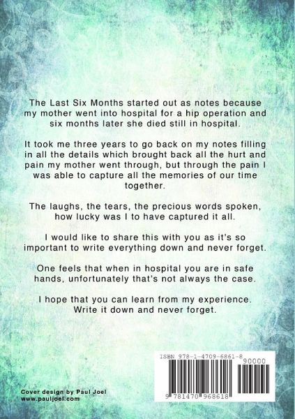 The Last Six Months is a moving story about my mother Kay who went into an NHS hospital for a routine hip operation. Her condition deteriorated soon after her operation so I started writing notes every day. Six months later I was still writing, and sadly she died while still in the hospital. My notes have become an up-to-date diary during this terrible and tragic course of events, it has also allowed me to remember the many wonderful conversations, the laughter, the tears, the anxieties, and the closeness we had. I hope from reading my mother's story, and from my readers who have kindly contributed their own stories of loved ones they should never be yesterday's news, it's so important that these stories are shown and not forgotten. Together we can make a difference. Strength In Numbers