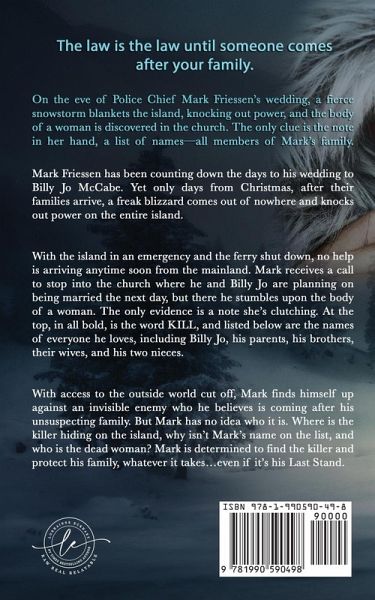 The law is the law until someone comes after your family. From New York Times & USA Today bestselling author Lorhainne Eckhart comes a new Billy Jo McCabe mystery set on a small island town in the Pacific Northwest. On the eve of Police Chief Mark Friessen's wedding, a fierce snowstorm blankets the island, knocking out power, and the body of a woman is discovered in the church. The only clue is the note in her hand, a list of names-all members of Mark's family. Mark Friessen has been counting down the days to his wedding to Billy Jo McCabe. Yet only days from Christmas, after their families arrive, a freak blizzard comes out of nowhere and knocks out power on the entire island. With the island in an emergency and the ferry shut down, no help is arriving anytime soon from the mainland. Mark receives a call to stop into the church where he and Billy Jo are planning on being married the next day, but there he stumbles upon the body of a woman. The only evidence is a note she's clutching. At the top, in all bold, is the word KILL, and listed below are the names of everyone he loves, including Billy Jo, his parents, his brothers, their wives, and his two nieces. With access to the outside world cut off, Mark finds himself up against an invisible enemy who he believes is coming after his unsuspecting family. But Mark has no idea who it is. Where is the killer hiding on the island, why isn't Mark's name on the list, and who is the dead woman? Mark is determined to find the killer and protect his family, whatever it takes...even if it's his Last Stand.