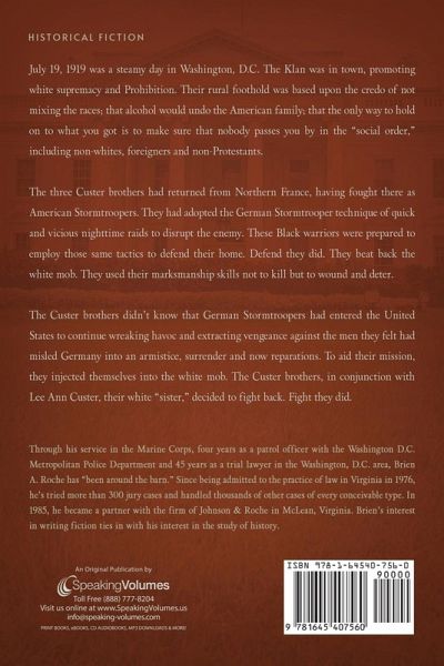 July 19, 1919, was a steamy day in Washington, D.C. The Klan was in town, promoting white supremacy and Prohibition. Their rural foothold was based upon the credo of not mixing the races; that alcohol would undo the American family; that the only way to hold on to what you got is to make sure that nobody passes you by in the "social order," including non-whites, foreigners and non-Protestants. The three Custer brothers had returned from Northern France, having fought there as American Stormtroopers. They had adopted the German Stormtrooper technique of quick and vicious nighttime raids to disrupt the enemy. These Black warriors were prepared to employ those same tactics to defend their home. Defend they did. They beat back the white mob. They used their marksmanship skills not to kill but to wound and deter.The Custer brothers didn't know that German Stormtroopers had entered the United States to continue wreaking havoc and extracting vengeance against the men they felt had misled Germany into an armistice, surrender and now reparations. To aid their mission, they injected themselves into the white mob. The Custer brothers, in conjunction with Lee Ann Custer, their white "sister," decided to fight back. Fight they did.