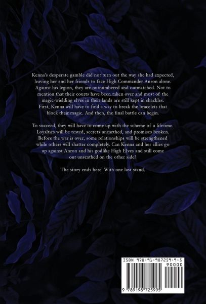 Kenna's desperate gamble did not turn out the way she had expected, leaving her and her friends to face High Commander Anron alone. Against his legion, they are outnumbered and outmatched. Not to mention that their courts have been taken over and most of the magic-wielding elves in their lands are still kept in shackles. First, Kenna will have to find a way to break the bracelets that block their magic. And then, the final battle can begin. To succeed, they will have to come up with the scheme of a lifetime. Loyalties will be tested, secrets unearthed, and promises broken. Before the war is over, some relationships will be strengthened while others will shatter completely. Can Kenna and her allies go up against Anron and his godlike High Elves and still come out unscathed on the other side? The story ends here. With one last stand.