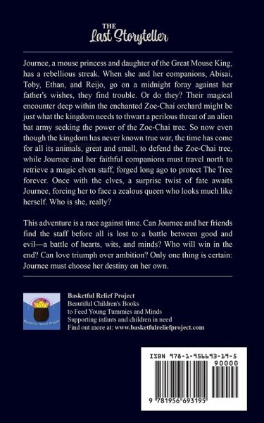 Fire Tests the Purity of Silver and Gold, but the Lord Tests the Heart. Journee, a mouse princess and daughter of the Great Mouse-King, has a rebellious streak. When she and her companions, Abisai, Toby, Ethan, and Reijo, go on a midnight foray against her father's wishes, they find trouble. Or do they? Their magical encounter deep within the enchanted Zoe-Chai orchard might be just what the kingdom needs to thwart a perilous threat of an alien bat army seeking the power of the Zoe-Chai tree. So now even though the kingdom has never known true war, the time has come for all its animals, great and small, to defend the Zoe-Chai tree, while Journee and her faithful companions must travel north to retrieve a magic elven staff, forged long ago to protect The Tree forever. Once with the elves, a surprise twist of fate awaits Journee, forcing her to face a zealous queen who looks much like herself. Who is she, really? This adventure is a race against time. Can Journee and her friends find the staff before all is lost to a battle between good and evil-a battle of hearts, wits, and minds? Who will win in the end? Can love triumph over ambition? Only one thing is certain: Journee must choose her destiny on her own. The Last Storyteller is the fourth book in The Pearls of Wisdom Series: Stories Inspired by a Biblical Proverb. The Last Storyteller is a children's chapter book for ages 9 and up.