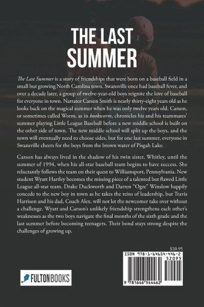 The Last Summer is a story of friendships that were born on a baseball field in a small but growing North Carolina town. Swansville once had baseball fever, and over a decade later, a group of twelve-year-old boys reignite the love of baseball for everyone in town. Narrator Carson Smith is nearly thirty-eight years old as he looks back on the magical summer when he was only twelve years old. Carson, or sometimes called Worm, as in bookworm, chronicles his and his teammates' summer playing Little League Baseball before a new middle school is built on the other side of town. The new middle school will split up the boys, and the town will eventually need to choose sides, but for one last summer, everyone in Swansville cheers for the boys from the brown water of Pisgah Lake. Carson has always lived in the shadow of his twin sister, Whitley, until the summer of 1994, when his all-star baseball team begins to have success. She reluctantly follows the team on their quest to Williamsport, Pennsylvania. New student Wyatt Hartley becomes the missing piece of a talented but flawed Little League all-star team. Drake Duckworth and Darren "Ogre" Winslow happily concede to the new boy in town as he takes the reins of leadership, but Travis Harrison and his dad, Coach Alex, will not let the newcomer take over without a challenge. Wyatt and Carson's unlikely friendship strengthens each other's weaknesses as the two boys navigate the final months of the sixth grade and the last summer before becoming teenagers. Their bond stays strong despite the challenges of growing up.