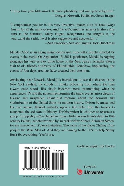 "I truly love your little novel. It reads splendidly, and was quite delightful."--Douglas Messerli, Publisher, Green Integer "I congratulate you for it. It's very inventive, makes a lot of head (way) humor by all the name-plays. And the self-conscious narrator is also a fine turn in the narrative. Many laughs, recognitions and delights in the text...and the satiric level is also suggestive and successful..."--San Francisco poet and linguist Jack Hirschman The Last Tale of Mendel Abbe Mendel Abbe is an aging manic depressive story teller deeply affected by events in the world. On September 15, 2001, perchance, Mendel is napping alongside his wife as they drive home on the New Jersey Turnpike after a visit to old friends northwest of Philadelphia. Somehow, implausibly, the events of four days previous have escaped their attention. Awakening near Newark, Mendel is incredulous to see the absence in the New York skyline, the clouds of smoke billowing from where the twin towers once stood. His shock becomes more traumatizing when he experiences TV and the government turning the tragic events into a circus of bizarre and misplaced chauvinist rhetoric about the heroism and victimization of the United States in modern history. Driven by angst, and his own nature, Mendel embarks upon a tale taller than the towers to recuperate the sad state of history. For his project he chooses to resurrect a group of foppishly naïve characters from a little known Jewish shtetl in 19th century Poland, people invented by an earlier New Yorker, Solomon Simon, for the amusement of Jewish children. The name of the place: Chelm; of the people: the Wise Men of. And they are coming to the U.S. to help Sonny Bush fix everything. You'll see.