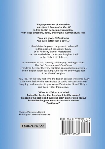 Faithful rendition of Nietzsche's Also Sprach Zarathustra, Part lV, in English playscript adaptation. Includes stage directions and original German text in a beautiful Fraktur font. "You are good, O Zarathustra, and even better than a cow" ...thus Nietzsche passed judgement on himself in this most self-consciously funny of all his many playful masterpieces - the one in which he consecrates Laughter itself as the Holiest of Holies... A celebration of wit, comedy, philosophy, and high-spirits, the Last Temptation of Zarathustra is rendered here for the very first time as a rapturous playscript, and in English idiom sparkling with the wit and winged-feet of the Master's original. Thus, too, for the very first time the English-speaker will come away with a real feel for this masterpiece of comic self-consciousness: laughing, and tempted to pronounce Zarathustra himself Holy - and even Holier than a cow. "What luck! What a wonder! Praised be the day that lured me into this swamp! Praised be the best blood-pumping brain-drainer alive today! Praised be the great leech-of-conscience himself: Zarathustra!"